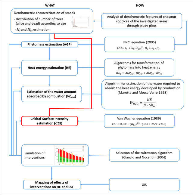 Chestnut coppices are among the formation most affected by fires in the Mediterranean environment. In the absence of cultivation treatments, the structure of the stands appears without vertical and horizontal interruptions in the canopy, with a considerable expansion of the fuel load. In this study, we showed the importance of silvicultural interventions on the mitigation of the fire in the chestnut coppices of southern Italy. In the study sites, we estimated the pyrological potential in terms of heat energy produced per surface unit and the variation in the critical surface intensity. Following silvicultural interventions, the reduction of heat energy is between 12.5 and 50%, and the extinguishing water saving are between 270 and 1,157 Mg·ha-1. The reduction of the probability of the passage of the surface fire to a crown fire can be up to 375%. With the same environmental conditions and dendro-structural characteristics, most effective interventions were observed for rotation cycles of 30 years, compared to shorter rotation cycles. This study showed the importance that silvicultural interventions, such as cleaning and bottom-up thinning, have at both the stand and territorial level on fire risk mitigation.